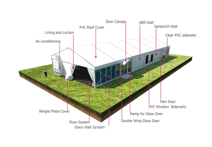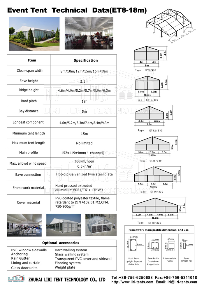 The Event Tents for sale are available in clear span width of 8m, 10m, 12m, 15m, 16m, and 18m. All of the event tent with a standard side height of 3.3m. Event Tents are a modular design which can be increased or decreased in 5m. The main frameworks (upright support and roof beam) are manufactured with 4 channels in the size of 152x119x4mm hard pressed extruded aluminum. The sidewalls and the roof covers are manufactured with 850g/m2 PVC-coated polyester textile and flame retardant to DIN4102 B1, M2. It is easy to assemble and dismantle as well as convenient to store because of its small volume. It has a wind load of 100km/hr. The fabric is available in both block-out and translucent.