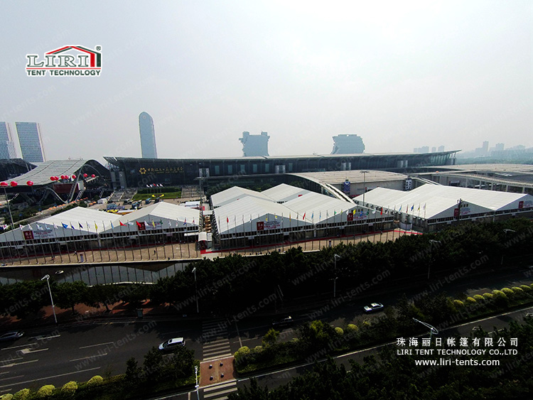 The clear span of Exhibition Tent for Canton Fair is from 20-60m. The main profile size is 350x120x5mm and the modular structure can be increased and decreased in bay distance of 5m according to the clients’ request. The main frameworks (upright support and roof beam) are manufactured of high impact extruded anodized aluminum (6061/T6). The PVC covers use PVC-coated polyester textile and flame retardance which is based on the European standard DIN 4102B1, M2.