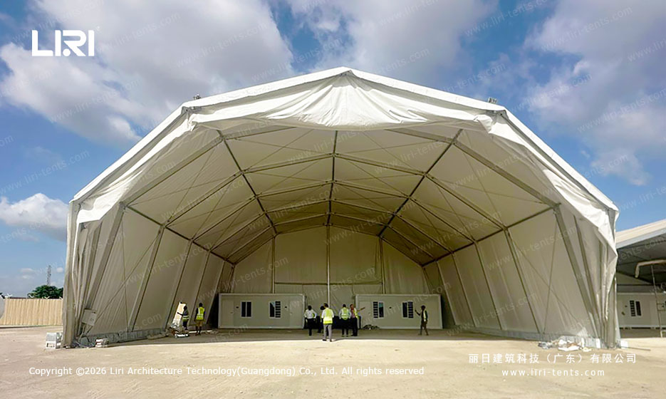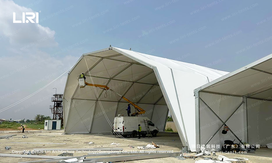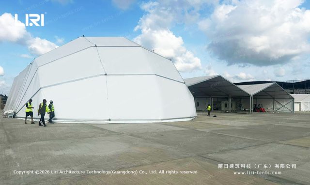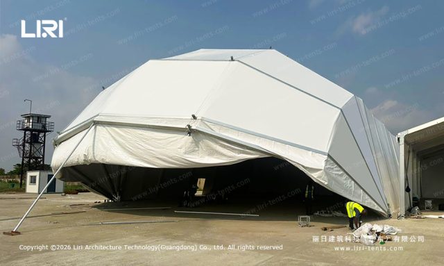 The membrane features 850g/m² double-sided PVC-coated polyester, offering superior self-cleaning properties and B1-level flame retardancy. The 20m clear-span design ensures that sensitive avionics remain within a stable, protected microclimate.