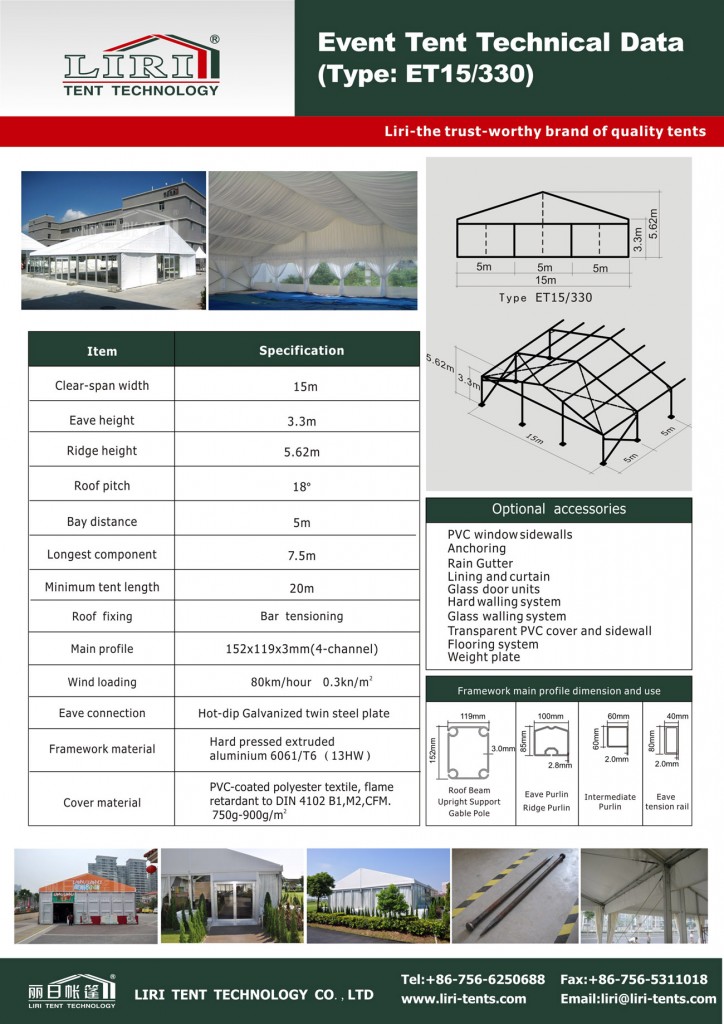 The main frameworks (upright support and roof beam) are manufactured with 4 channels in the size of 152x119x4mm hard pressed extruded aluminum. The sidewalls and the roof covers are manufactured with 850g/m2 PVC-coated polyester textile and flame retardant to DIN4102 B1, M2. It is easy to assemble and dismantle as well as convenient to store because of its small volume. It has a wind load of 100km/hr. The fabric is available in both block-out and translucent.