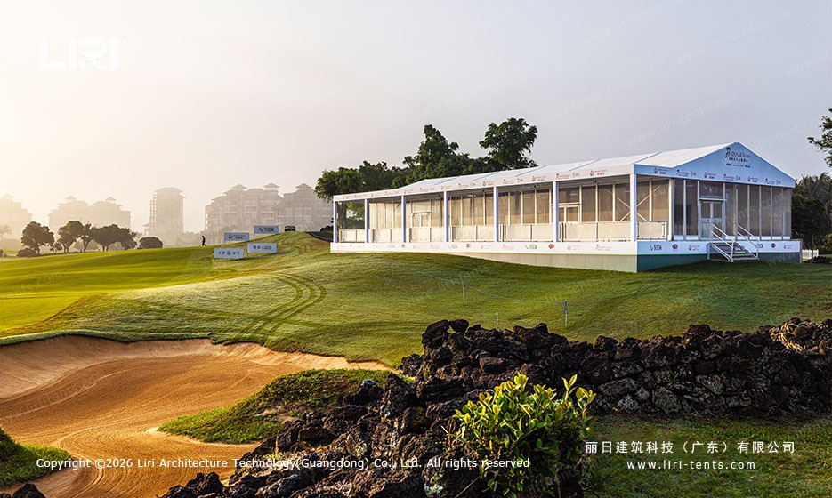 This is no ordinary temporary setup; it is a precision-engineered event marquee hospitality complex designed for premier tournaments.