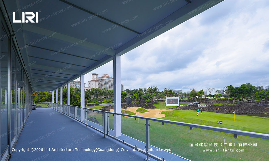 Panoramic Glass Facades: Replacing traditional PVC fabric with tempered glass systems ensures an unobstructed 360-degree view of key locations, such as the 9th hole.