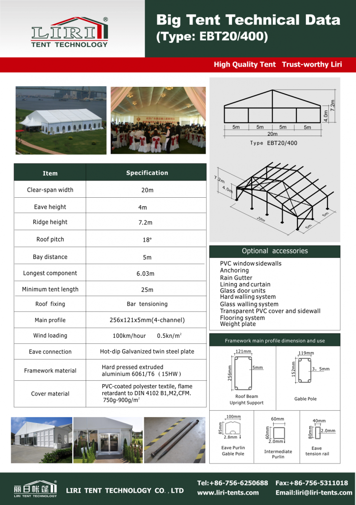 The clear span if the Big Tent-EBT Series is 20m, 21m, 25m, and 30m. The main profile size of the tent is 256x121x5mm and its modular structures can be increased and decreased in bay distance of 5m according to the clients’ requirements. The main frameworks (upright support and roof beam) are manufactured with high impact extruded anodized aluminum (6061/T6). The PVC covers use PVC-coated polyester textile and flame retardance which is based on the European standard DIN 4102B1, M2.