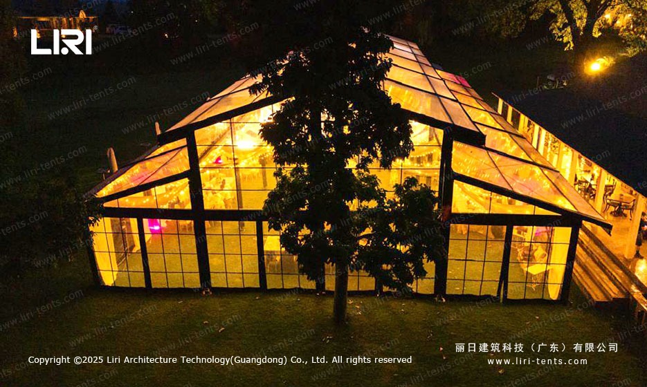 Imagine a unique and tasteful glass Orangery Marquee for your next event. As night falls, warm yellow light filtering through the transparent roof panels can reflect the stars, creating a solemn and elegant space where newlyweds make lifelong commitments.