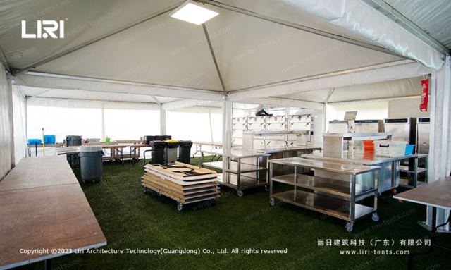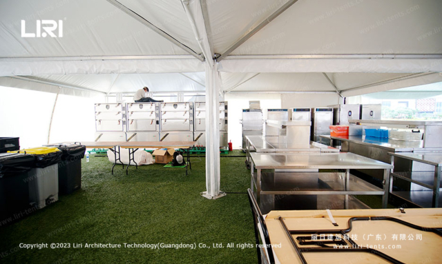 The main event area consisted of a marquee and a few pylon tents for back-of-house and work areas. It can accommodate various styles and charms, making it suitable for organizing luxurious dinner parties, simple outdoor events, or any other special events.