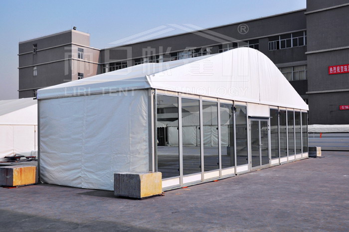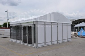 HDT 4x3m: eave height is 2.6m and ridge height is 3.84m. The length of the tent can be added or reduced by every 3m. The aluminum main profile is 100x48x3mm. The frame of the Half Dome tent uses the hard pressed extruded Aluminum Alloy 6061/T6 (13HW). Roof covers and sidewalls use polyester textile with double PVC layer, water proof, UV resistant according to DIN4102 B1, M2.