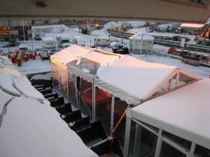 Snow: Tents, canopies, structures, and shelters are not manufactured to withstand heavy snow loading. These products need to not be used if snow of any kind is present or anticipated, and guest should be evacuated immediately in case of snow load collapse.