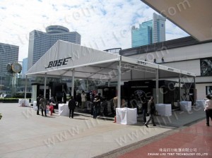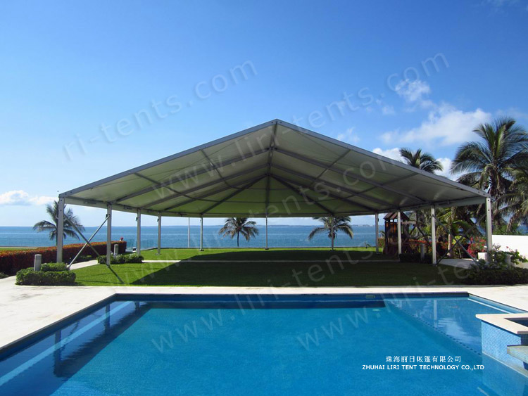 Gala marquee tent for sale series are available in clear-span width of 10m,12m, and 15m, all with a standard side height 3 m. Gala marquee are modular design and can be extended or decreased in 5m section. The main frameworks (upright support and roof beam)are manufactured by 4 channel in size 166x88x3mm, hard pressed extruded Aluminium . The sidewalls and roof covers are manufactured of 850g/m2 PVC-coated polyester textile, flame retardant to DIN4102 B1,M2. The fabric are available in block-out or translucent.