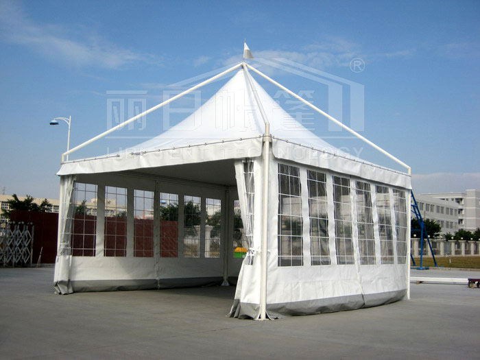 The standard Gazebo Tent for sale with the side height of 2.5m is available in 3x3m, 4x4m, 5x5m, and 6x6m. All the framework and junctions are made out of aluminum alloy. It is easy to assemble the roofs because it uses eyelets and sliding plastic resin balls to fix it. The optional accessories for the Gazebo tent include clear windows, lining, weight plate, rain gutter, digital printing, etc.