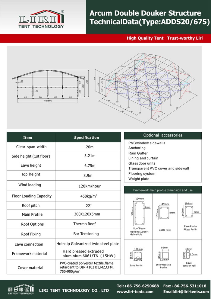 Arcum Double Decker tent flame material adopt Reinforced aluminum alloy 6061/T6 extruded profile, surface anodized finish, and Roof Covers and side walls are 850g/m2 PVC-coated polyester textile flame retardant to DIN4102 B1, M2. Besides, the flooring structural support adopts our high-quality wooden beams and the second-floor system adopts a 28mm thick waterproof splint. Liri Tent double-decker tent is always strong and durable with its 100km/h wind speed resistance. The tents special design for ADDS with curved beams and a roof bar tensioning system which helps it to resist higher wind speed and snow loading capacity.