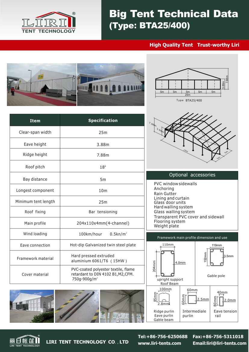 The clear span if the Big Tent-EBT Series is 20m, 21m, 25m, and 30m. The main profile size of the tent is 256x121x5mm and its modular structures can be increased and decreased in bay distance of 5m according to the clients’ requirements. The main frameworks (upright support and roof beam) are manufactured with high impact extruded anodized aluminum (6061/T6). The PVC covers use PVC-coated polyester textile and flame retardance which is based on the European standard DIN 4102B1, M2.