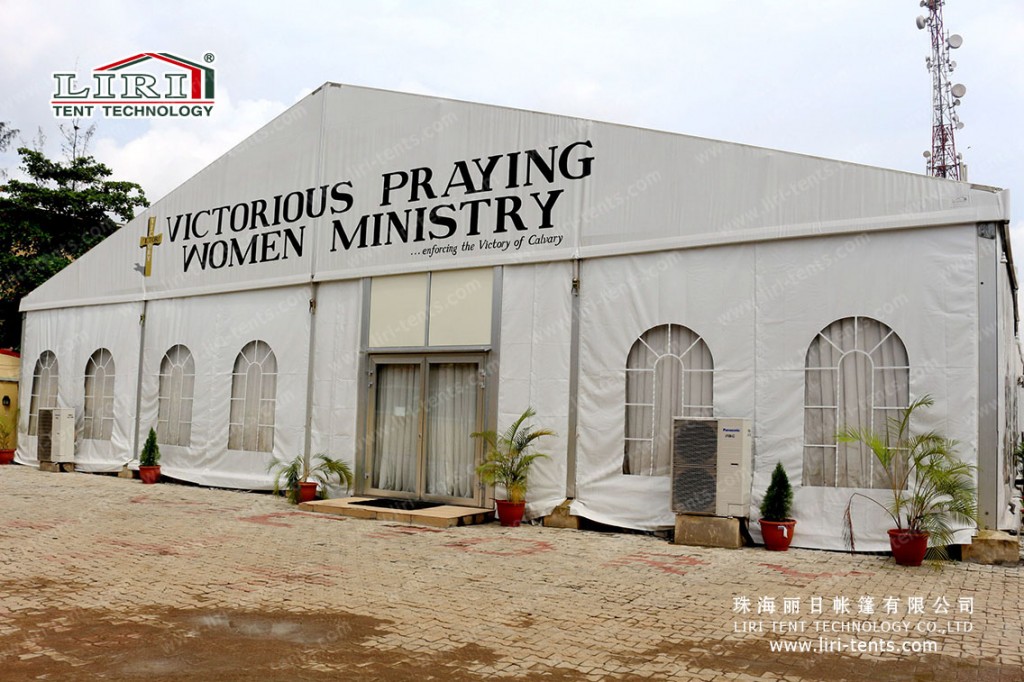 The clear span if the Large Church Tent-EBT Series is 20m, 21m, 25m, and 30m. The main profile size of the tent is 256x121x5mm and its modular structures can be increased and decreased in bay distance of 5m according to the clients’ requirements. The main frameworks (upright support and roof beam) are manufactured with high impact extruded anodized aluminum (6061/T6). The PVC covers use PVC-coated polyester textile and flame retardance which is based on the European standard DIN 4102B1, M2.