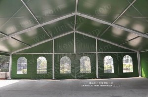 How can professional military training have less supporting military tents, strong resistance, or typhoon resistant? Military tents use high-strength aluminum alloy tubes, high-end PVC tarpaulin combination, and retardant double-sided PVC synthetic fiber cloth. The flame retardant is up to the European standards DIN4102 B1, M2. The colors that you can choose for the tarp includes Army green, white, or camouflage. All Liri Tents can be used as military tents and the span can be from 3m to 60m, which can be multiplied by 3m or 5m in length. For example: 6x12m, 8x15m, 15x25m, and 40x80m.