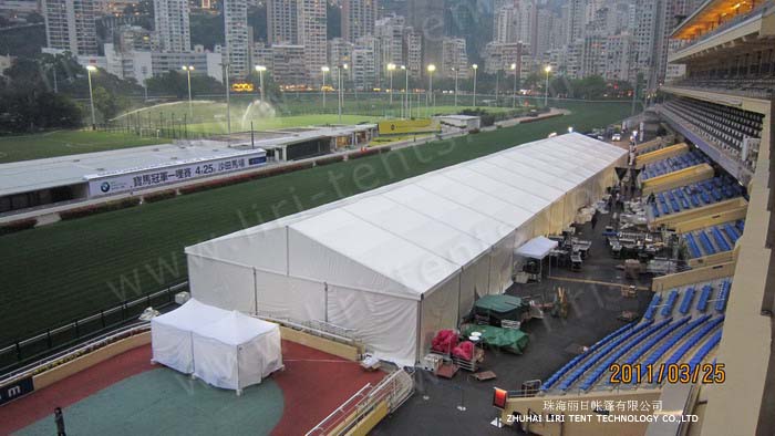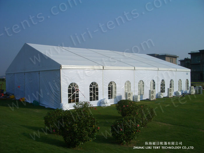 The New Holiday Tent for sale is available in 4 clear-span width sizes: 6m, 9m, 12m and 15m. The eave height of the tent is 2.6m. The tent structure uses a unit modular design and the length can be increased or decreased by 3m for the bay distance. The frameworks main profile (upright support & roof beam) is 122x68x3mm with 4 channels. The framework material is hard pressed extruded aluminum alloy. The cover material is PVC-coated polyester textile, flame retardant to DIN 4102 B1, M2, and CFM, 850g/sqm. There are two kinds of fabric that can be chosen: block-out and translucent. The New Holiday tent also has optional accessories, like flooring, glass walls, ABS walls, glass doors, ceilings, and inside curtains, which will help satisfy your every tent need.