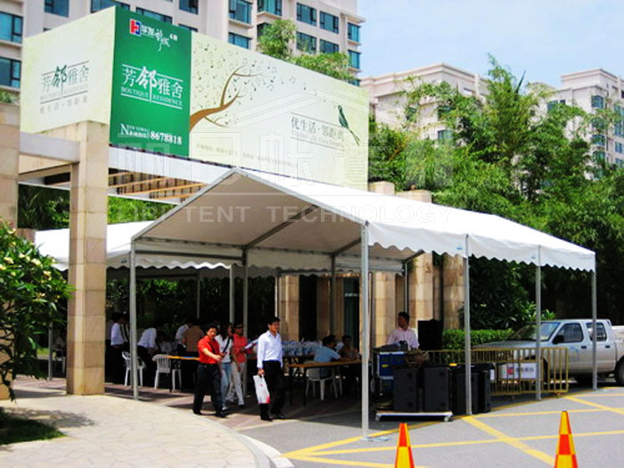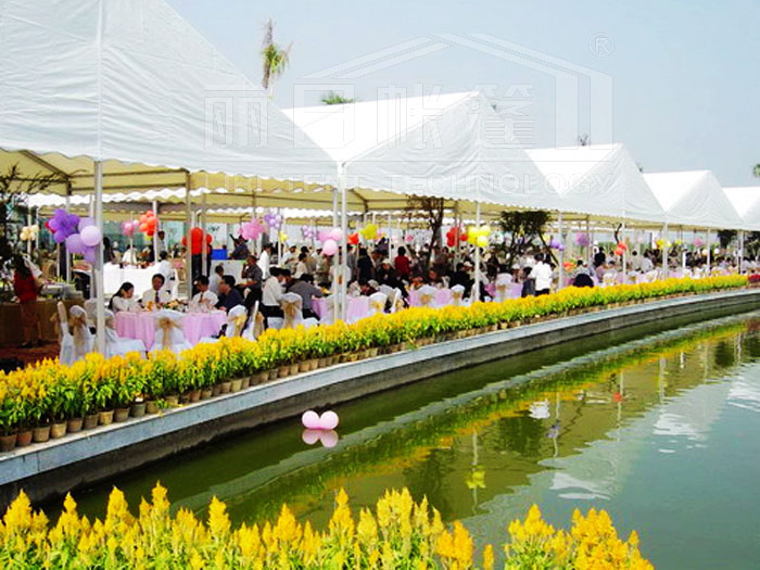 The Marquee Tent for sale are available in clear span width of 3m, 4m, 5m, 6m, 8m, 9m, and 10m with all of them having the side height of 2.6m. The Party tents are modular by design and may be increased or decreased in 3m. The main frameworks (upright support and roof beam) are manufactured in 2 channels 82x48x3mm hard pressed extruded aluminum. The sidewalls and roof covers are manufactured with 850g/m2 PVC-coated polyester textile flame retardant to DIN4102 B1, M2. The fabric is available in block-out or translucent.
