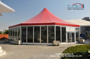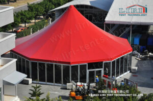 The Polygon High Peak Tent for sale is built on the basis of the hexagon, octagon, decagon, and dodecagon tents. Polygon High peak also changes the ridge of the tent into a high peak. The tent frame uses hard pressed extruded aluminum alloy (6061/T6) and the roof cover uses PVC-coated polyester textile. It can resist up to 100km/hr in wind load. It is easy to assemble, dismantle, and store because of its small volume.