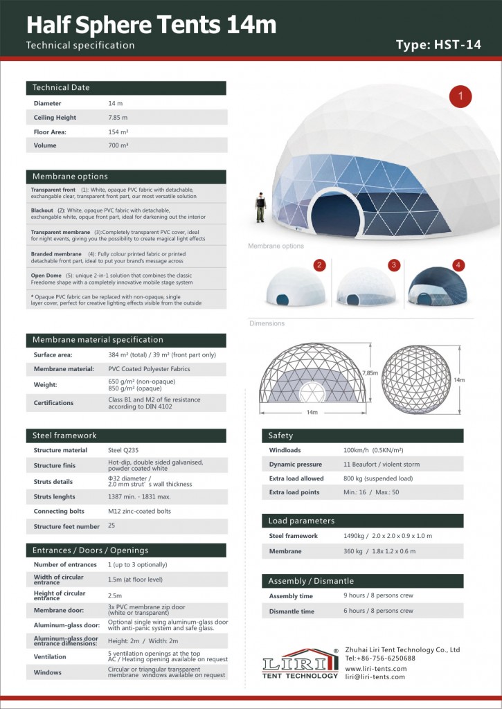 LIRI Geodesic Dome Tent is made of special high strength steel, zinc plated or painted, the roof cover uses the PVC fabric, can be equipped with glass doors, sizes radius 8m, 10m, 15m, 20m, 25m, 30m. Its strong and convenient structural advantages and unique node design, greatly enhances the structural stability so as to ensure that the tents have outstanding performance under any extreme weather conditions.