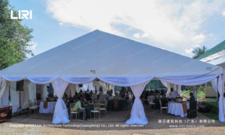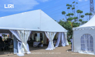 Marquee-Tent offers marquee tents in curved/round/spire/multi-peaked roof shapes. The different shapes have a significant effect on the terrain/wind/rain. we offer marquee tents in different span widths of 5x10m, 10x20m, 12x30m, and 14x40m with a standard height of 6m. For the walls, we have glass walls, transparent windows, white removable fabric, etc.